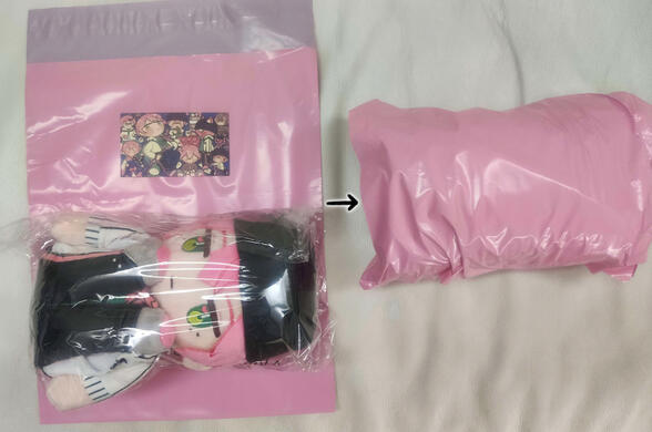 Plushies from PDstore are packaged in a plastic mailing bag, and are wrapped tightly in order to make sure the plushie remains safe during the shipping process.Because of how they are packaged, they will be lying down sideways with other post on top, squashing and deforming it. This tends to affect the head the most, and plushies may become long headed after shipping.